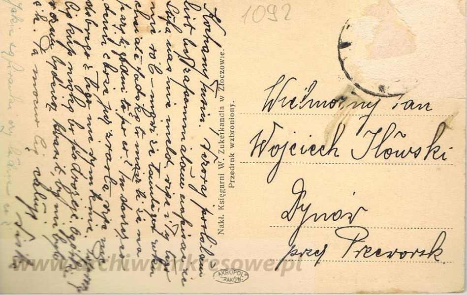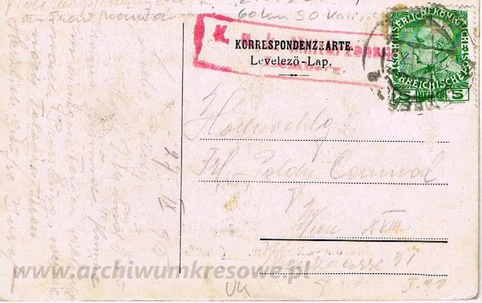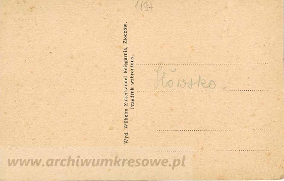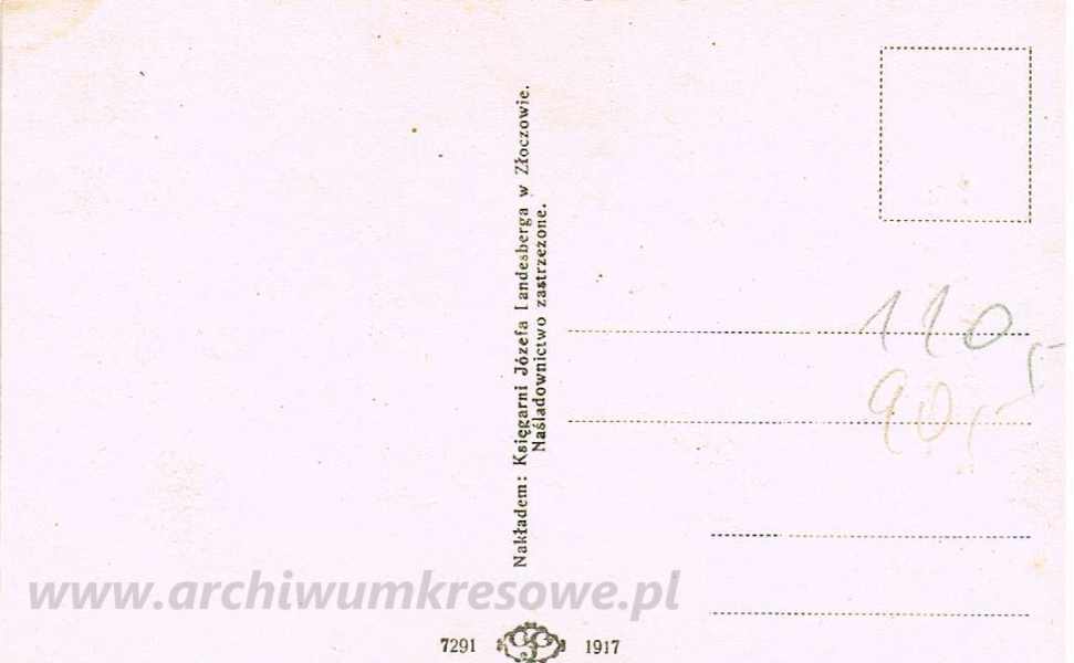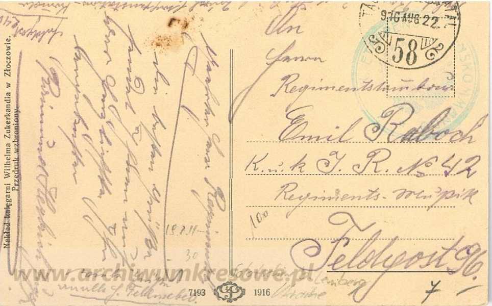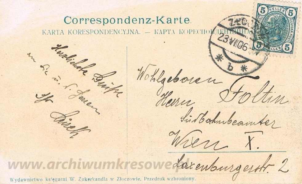 1911, Złoczów, Nakład Księgarni M. Zukerkandla w Złoczowie. Karta wysłana do Pragi: Georg Feitch. Treść: Proszę mi wybaczyć, że wcześniej nie napisałem listu, ale w ogóle nie wychodzę, ponieważ nie można wyjść z kasyna wcześniej niż major. Moi przełożeni są bardzo mili, szczególnie mój rotmistrz, kiedy zaprosiłem go na krótki urlop do Złoczowa, powiedział tylko ?wszystko jasne?. Otrzymałem aparat i robię dużo zdjęć. Śpię bardzo mocno. Pojutrze szczegółowy list. Ernest. Zbiory: Bogusław Mykietów Zielona Góra.