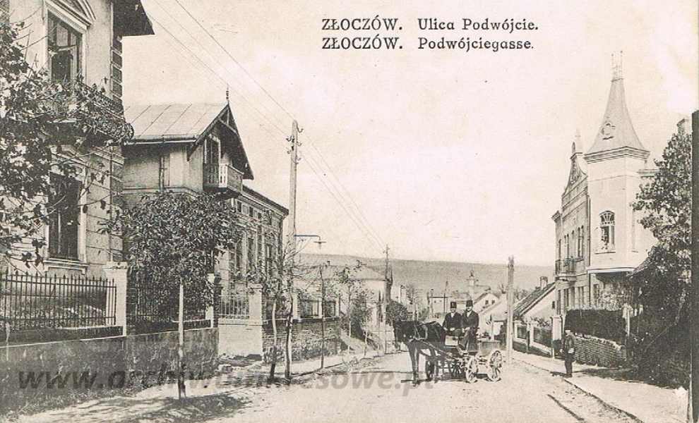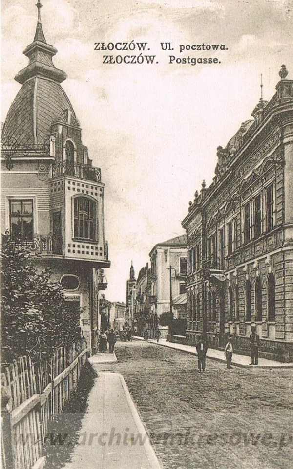 1918, 4 luty, Złoczów, ul. Podwójcie, w czasie I wojny Dom Żołnierza. W budynku znajdowała się piekarnia mechaniczna Mullera, odkupiona (po 1922 r.) przez Jurkiewiczów. Napis na odwrocie brzmi: Zum freundlichen Gedenken an froh verlebte Stunden im Soldatenheim. Zloczow und Schwester Margarethe Venator (Na pamiątkę wesoło spędzonych godzin w Domu Żołnierza. Złoczów i siostra Margarethe Venator.). Zbiory: Bogusław Mykietów Zielona Góra.