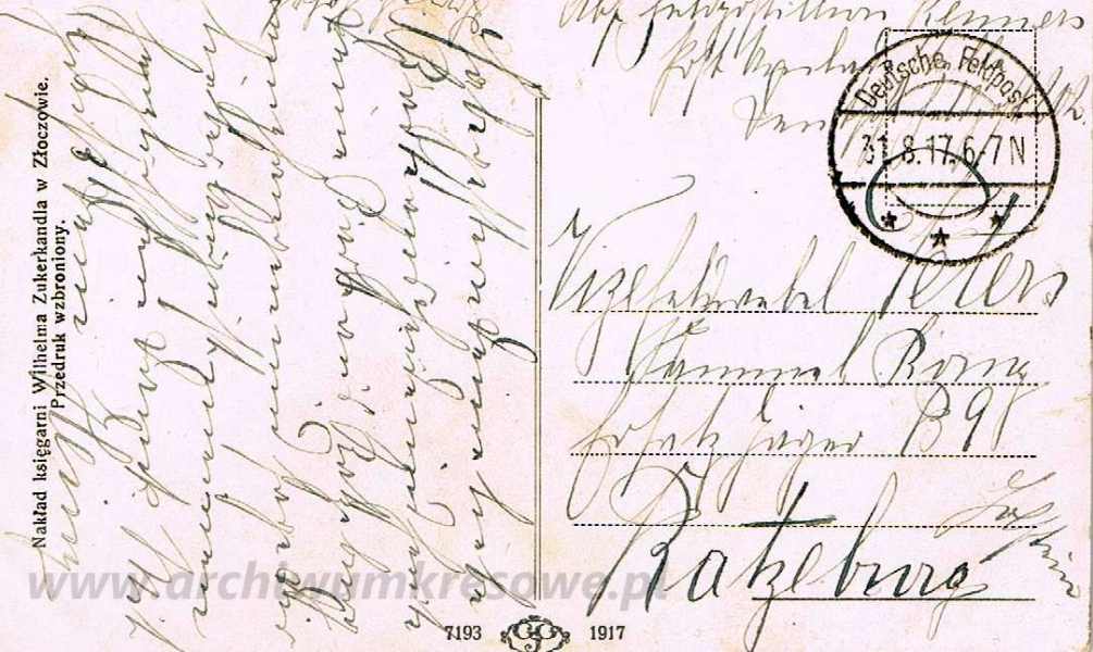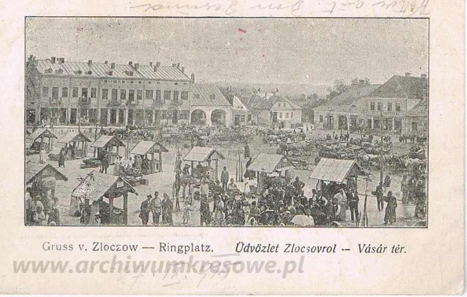 1917, 16 wrzesień, Złoczów, Rynek. Na odwrocie treść w języku niemieckim: Nadawca: Telegrafist A. Scharf, Ukraine Feldpost, Armee Fernsprach Abt. 101. Adresatka: Panna M. Kühn Gnadau bei Magdeburg. Treść: Zloczow, 16.9.1917. Kochana Ciociu! Skąd była kartka z 10., którą dziękując otrzymałem. Dzisiaj w nocy pójdzie dalej, w nieznane. Prawdopodobnie znasz kraj, w którym kwitną cytryny! Zloczow to całkiem miłe miasteczko. Właściwie w pobycie tu, w Galicji, nie ma nic złego. Z pozdrowieniami Adolf. Zbiory: Bogusław Mykietów Zielona Góra.